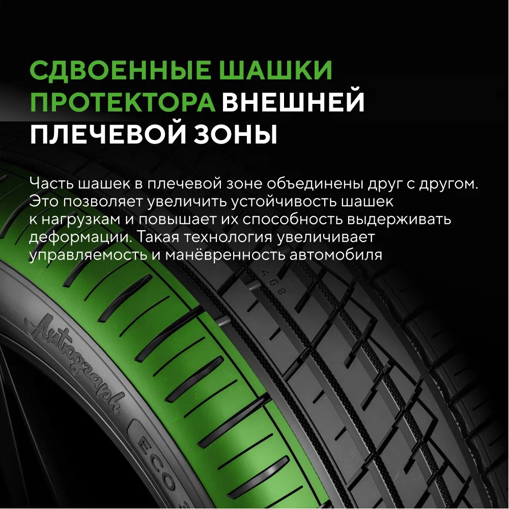 - Плавная и тихая езда, мягкий ход обеспечиваются технологией зонирования протектора. Сдвоенные блоки шашек на внешней плечевой зоне протектора распределены по всей окружности шины повышают акустический комфорт и минимизируют вибраций и шумы